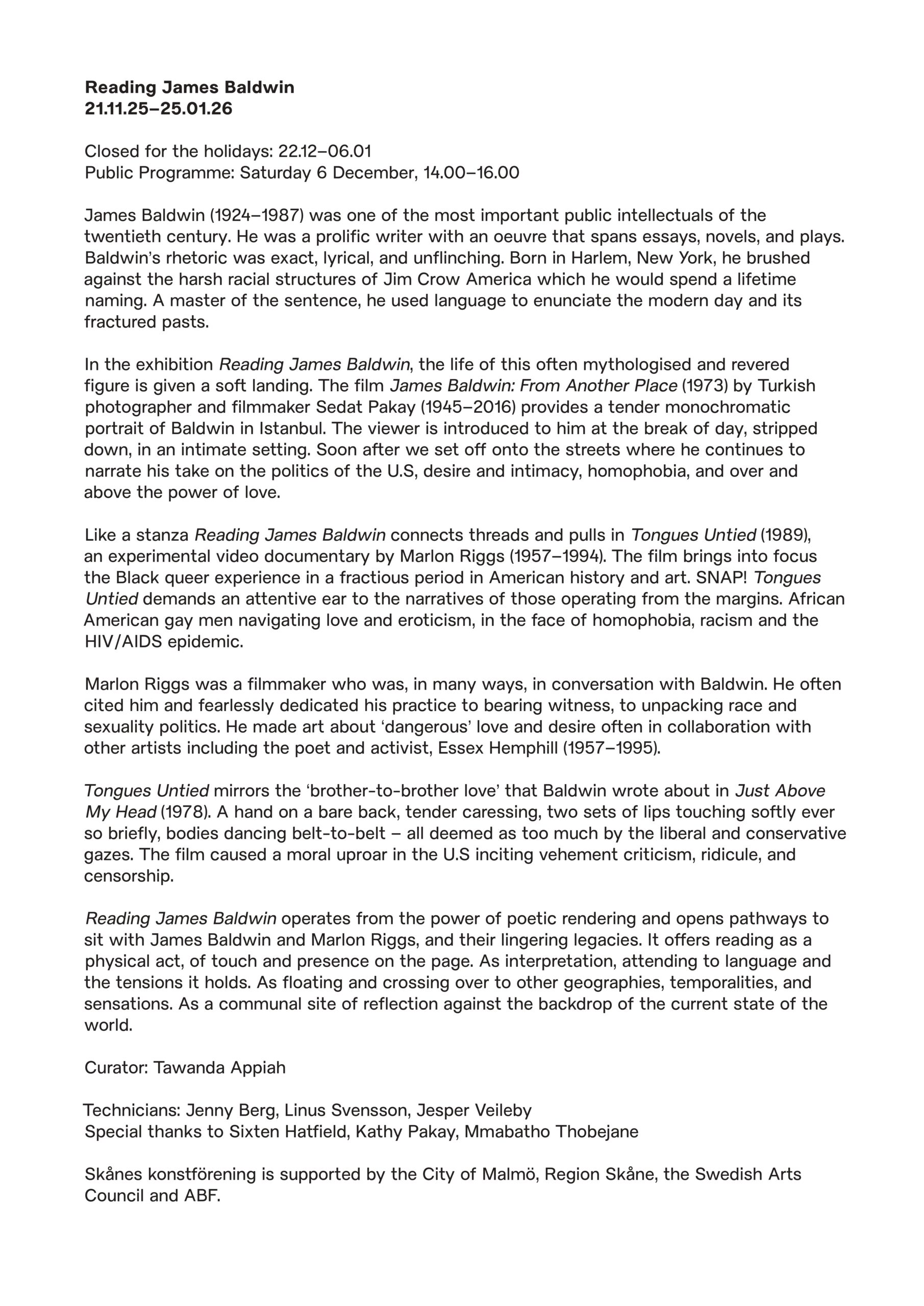 Reading James Baldwin operates from the power of poetic rendering and opens pathways to sit with James Baldwin and Marlon Riggs, and their lingering legacies. It offers reading as a physical act, of touch and presence on the page. As interpretation, attending to language and the tensions it holds. As floating and crossing over to other geographies, temporalities, and sensations. As a communal site of reflection against the backdrop of the current state of the world.