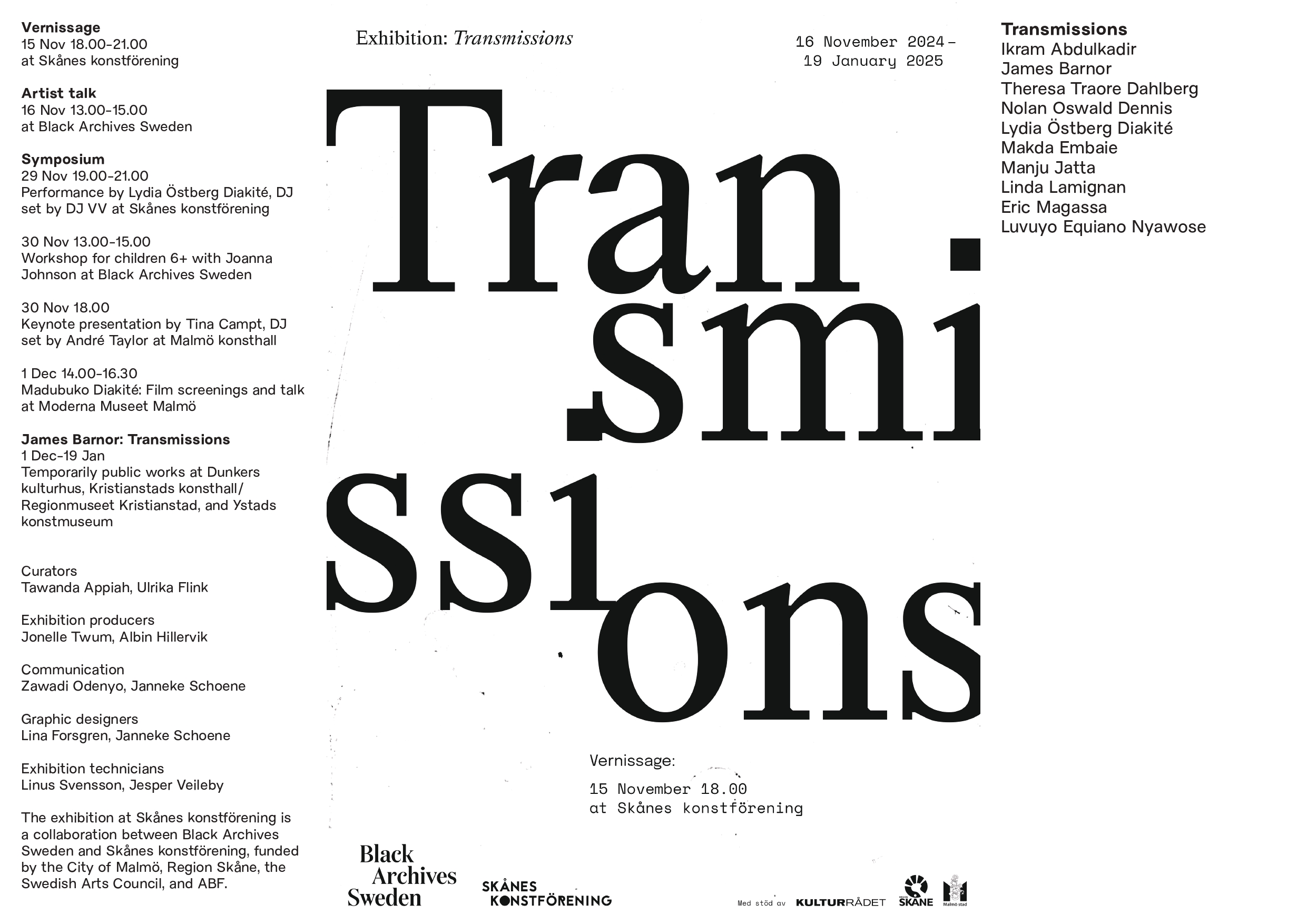 Transmissions also spreads across the Skåne region with temporary public works by James Barnor at Dunkers kulturhus, Kristianstads konsthall/Regionmuseet Kristianstad, and Ystad konstmuseum, as well as an international symposium at venues including Black Archives Sweden, Skånes konstförening, Malmö Konsthall, and Moderna Museet Malmö.