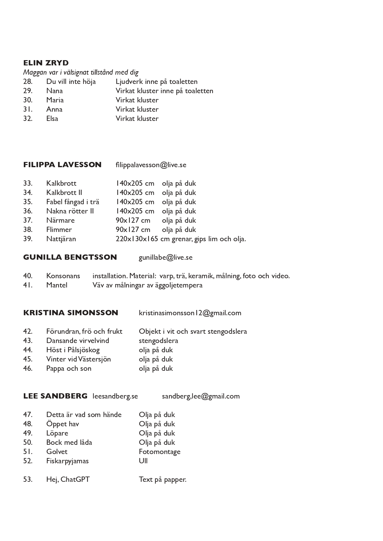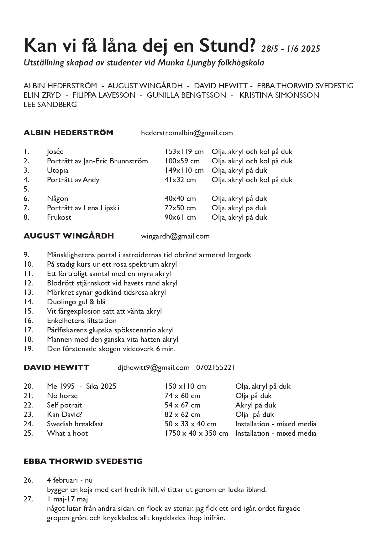 I augusti 2023 klev nio förväntansfulla personer in genom konstskolan Munkas ovissa dörrar. Vad tycker du om det? Ja det låter ju bra fast jag vet inte det är ju inte så fantasifullt. Nej ska det vara det kan vi inte bara berätta vad vi har gjort. Det är klart vi kan men det kan ju bli lite tradigt att läsa om. Ja men annars så kunde man fortsätta så här: Vi kom från olika håll, några med konsten i bagaget sedan många år, andra som är rätt oskrivna blad. Vi har fått leva, lära och växa i konsten. Vi har haft friheten att tolka det vi upplevt olika och för vardag har konsten blivit viktigare. Hur låter det? Det låter jättebra men viktigare och viktigare jag vet inte ibland är jag bara skittrött på alltihop och längtar efter att resa till Italien där kan man stå och måla hela dagarna. Men kan vi inte säga att vi ses på onsdag då nån gång på eftermiddagen? Jo visst men skriv inte ihop nåt mera nu vänta lite så jag får vara med också jag tänkte mig nåt lite galnare texten kunde ju vara lite som ett spontant konstverk. Visst jättebra. Hej ja jag har inte precis hunnit tänka det har varit skitmycket hela tiden och helgen gick åt med en massa stök. Okej men jag tänkte lite för jag vet ju att du har haft mycket så jag skrev ihop det här: Det var en mängd kurser i starten, det var performance, det var lera, det var måleri och video och foto och kroki och installation. Det var påfrestande, roligt och utmattande. Metoder och material som vi inte trodde vi skulle uppskatta, har vi kommit att älska. En del grejer som man verkligen inte ville göra dom blev jag faktiskt sugen på att fortsätta med. Vadå? Jamen video till exempel det kan ju bli hur dåligt som helst och stop motion kan bli förskräckligt men sen är det ändå roligt när det lyckas. Klart men det där var ju en ganska tråkig uppräkning av grejer det är dom väl inte intresserade av. Nej det är klart. Skriv om nåt kul som du minns eller nåt jättetråkigt. Herregud jag minns skitmycket jättetråkiga grejer sånt jag blev urförbannad på kommer du ihåg när nån hade sabbat mina skulpturer ute på fältet och sparkat av en hel rumpa när jag hade jobbat hur mycket som helst och sen hade någon bara tränat karatesparkar hur bara kan dom fattar du. Ja men glöm det nu konsten ska provocera sånt där händer. Det är lätt att säga när man inte själv provocerar. Men var det nåt som var roligt då? Kommer du ihåg när vi gjorde punkband i ettan det var ju galet kul helt fantastiskt jag hade så himla roligt alla var skitduktiga eller luciatåget tänk vad vi fick beröm för det hela skolan älskade det men vilken tid det tog att samlas och träna jag vet att jag var jätteutmattad då. Lugna ner dig nu jag har skrivit lite här lyssna nu: Det senaste året har vi njutit av friheten att utveckla våra egenheter och skillnader, att fördjupa oss. Till denna sista gemensamma utställning har alla skapat efter egna idéer och vi hoppas att tillsammans flyger vi. Bla bla bla har du skrivit det där eller har du bara hämtat det i någon AI chatt? Men herregud man behöver inte alltid vara så kritisk du kan vara glad över att jag inte säger resa eller utforska inga såna floskler det finns absolut inget AI i det här kommer du ihåg när jag försökte få chatten att göra en stickbeskrivning åt mig det gick åt skogen totalt det blev ju ingen tröja alls nån sorts dräkt blev det som ingen människa kan använda till nånting en jäkla massa garn i onödan men i alla fall man kunde avsluta lite såhär: Men ut ur redet ska vi ju antingen vi snubblar eller flyger. Bära eller brista. Men vadå skärp dig nu det är en konstutbildning det är vuxna människor konstmänniskor som kommer på en vernissage det är inte någon sorts förskoleavslutning det här. Det kan väl få vara lite lättsamt nån gång även i vuxenvärlden. Det låter inte seriöst tycker jag det här är ju en graduation det ska höras att vi är vuxna. Du får vara glad så länge jag inte pratar om resa eller utforska det kan alla vara tacksamma för här utforskas ingenting men det är väl i alla fall okej att vi slutar med att välkomna alla det är det väl inget fel på? Nej det är okej de kan komma hit och myllra runt och dricka cider och käka pinnar det kan vara rätt okej och det blir skönt när allt är på plats fast sen herregud sen ska det tas ner också och packas och forslas och repareras väggar en gång till sen hinner vi knappt hem förrän vi kan börja städa hela skolan ska du ha nåt sommarlov?