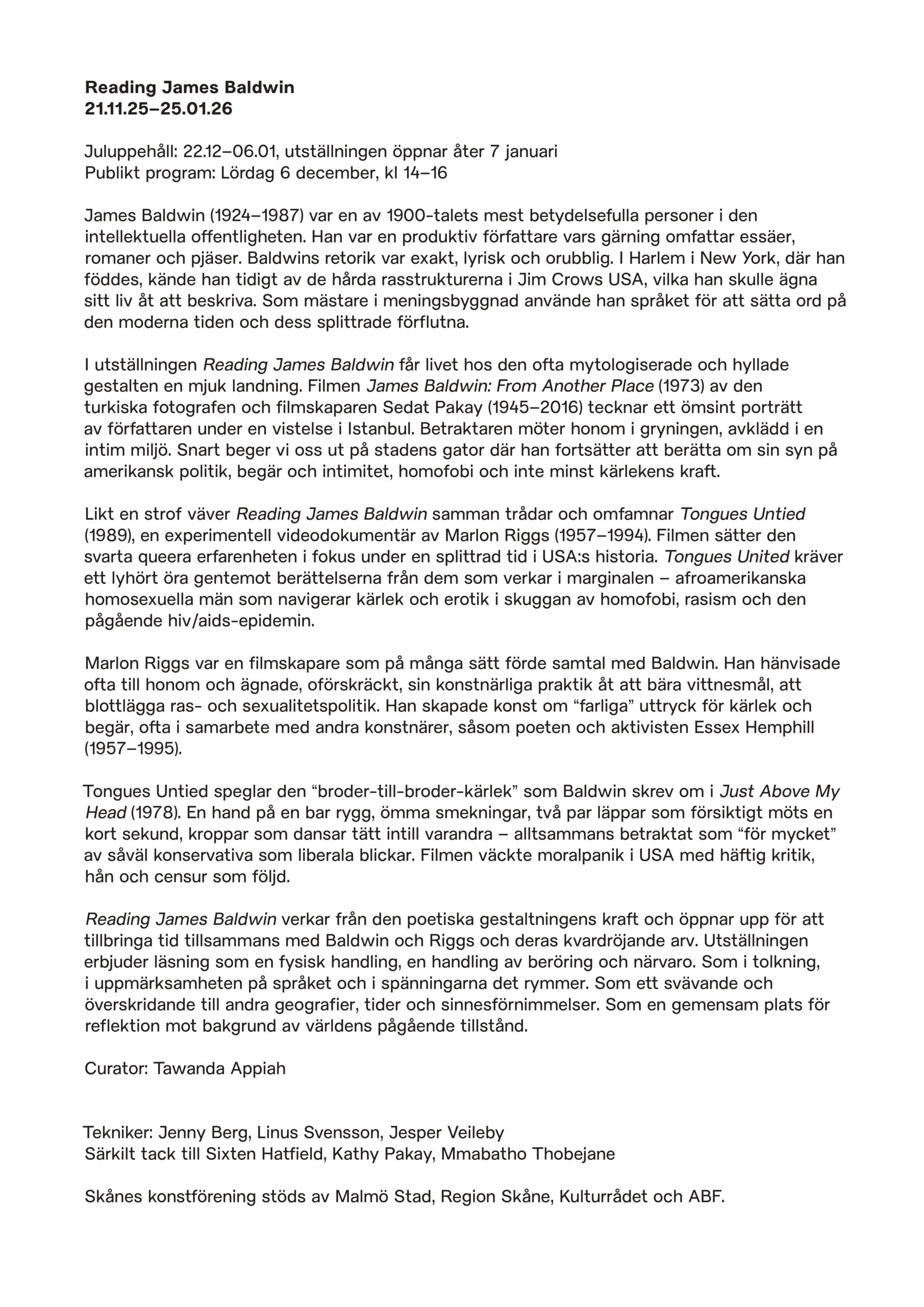 Reading James Baldwin verkar från den poetiska gestaltningens kraft och öppnar upp för att tillbringa tid tillsammans med Baldwin och Riggs och deras kvardröjande arv. Utställningen erbjuder läsning som en fysisk handling, en handling av beröring och närvaro. Som i tolkning, i uppmärksamheten på språket och i spänningarna det rymmer. Som ett svävande och överskridande till andra geografier, tider och sinnesförnimmelser. Som en gemensam plats för reflektion mot bakgrund av världens pågående tillstånd.